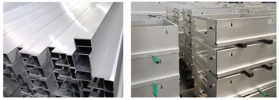 型材加工中心進(jìn)行電池托盤邊梁切削、雕銑等加工