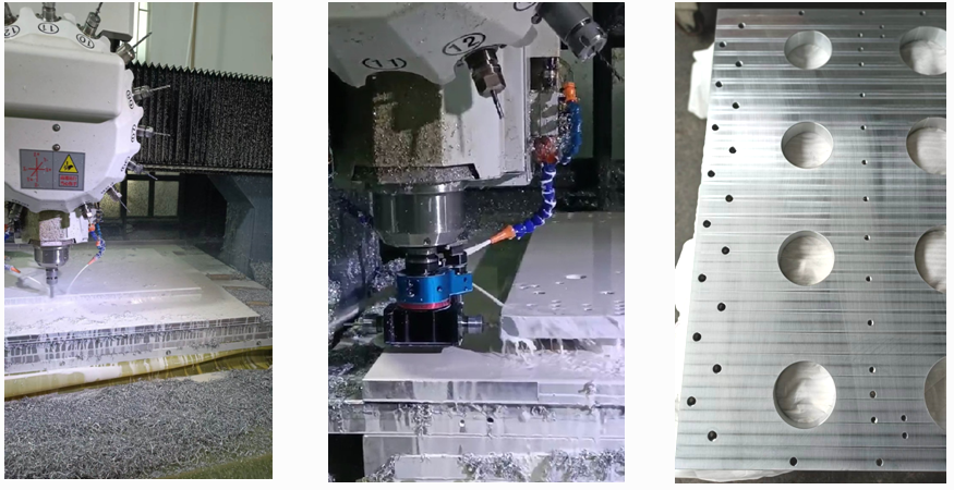 龍門加工中心對(duì)自動(dòng)化設(shè)備大鋁板進(jìn)行雕銑、鉆孔、攻牙、切削等加工