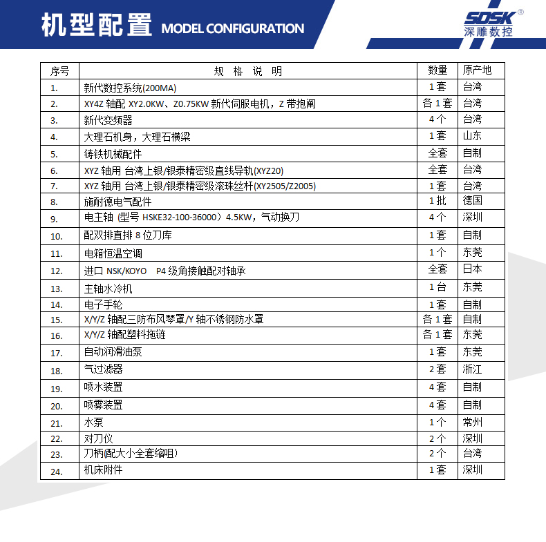 1、SDSK250-4Z-HSKE32機型是專門為客戶量身定做的四頭精雕機; 配雙排直排8位刀庫;運動方式為Y軸工作臺前后移動,X軸左右移動,Z軸上下移動。