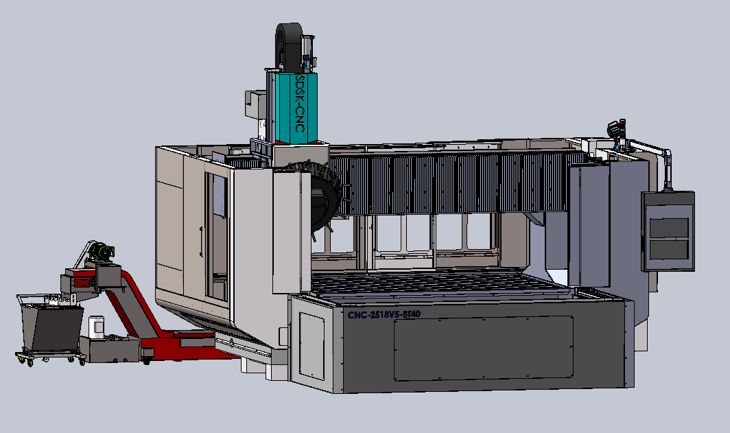 1、SDSK2518V5-BT40機(jī)型是專門(mén)為客戶量身定做的輕型2.5米龍門(mén)加工中心;定梁式結(jié)構(gòu);配有臺(tái)灣圣杰16位飛碟式刀庫(kù),換刀速度為2秒;運(yùn)動(dòng)方式為Y軸工作臺(tái)前后移動(dòng),X軸左右移動(dòng),Z軸上下移動(dòng)。